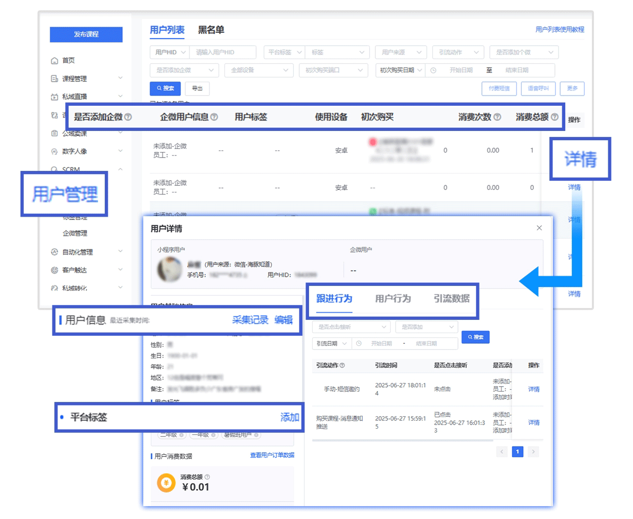 客户标签管理:通过系统记录用户的基本信息、需求、购买历史、互动记录等,自动生成用户标签。比如“25岁敏感肌宝妈”“职场新人需简历指导”,后续推送内容和活动时,老师就能精准匹配用户需求,避免无差别骚扰。